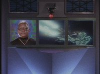 Grimlord's energy summons an energy screen above the mutants in the Dungeon, forming an image of General Ivar, motioning his right hand as he talks close. |