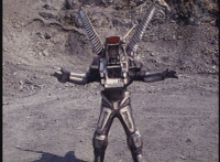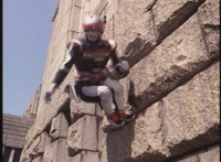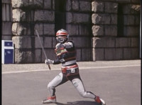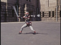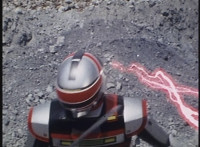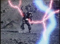 Zoom in on Eliminator scanning with his red eye, and his chest monitor showing VR JB as he rushes forth, jumps up, gets scanned again, and then the villain groin-punches VR JB as he flies over him, causing him to flip over onto his back. Eliminator extends his back foils and steps forth, VR JB reacting. |