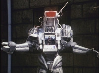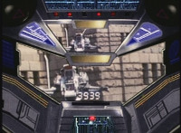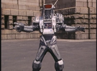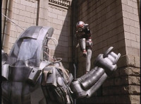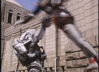VR JB races forth, leaps up, Eliminator scans him with his red eye, which shows what he sees on his chest targeting monitor. VR JB jumpkicks into Eliminator, who blocks the kick, sending VR JB flipping over, bounding off the wall, and aiming for the villain with his fists ready. |