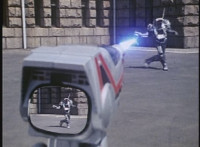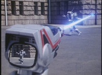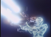 VR JB'S POV of Eliminator approaching, he prepares and whips out his VR Laser Pistol, firing it forth as Eliminator scans him doing so, allowing him to avoid each laser blast, which confuses VR JB as he continues firing and missing, so he stops and looks closer. |