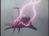 VR Skybase is struck repeatedly by pink electricity, but it flies on undeterred. |