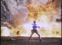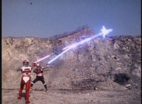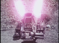 A giant energy image of VR JB fires the VR Techno Bazooka. |