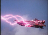 A Quantum Cruiser flies down through the clouds firing pink electricity. |