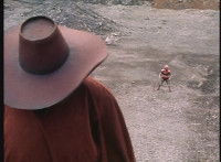 Gunslinger (now poncho-less) faces VR JB from across a field, VR JB speaks quickly, a shot of his POV of the villain, then Gunslinger talks up close while pacing to his left. |