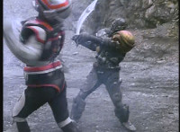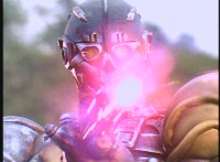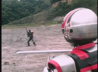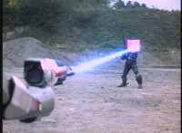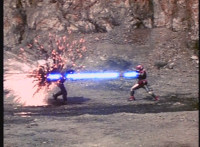 VR JB leaps up as dirt bursts behind him, firing his Laser Pistol forth, blasting Gunslinger's shotgun out of his hands and onto the ground. VR JB readies saber and slashes at Gunslinger, who blocks with his energy shield, knocking VR JB's saber out of his hands and onto the ground. |