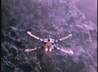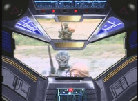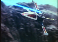 The Ravage Jet swoops down into a canyon, followed closely by the VR Interceptor. The Interceptor fires lasers forth. |