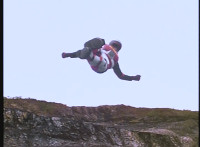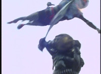 Shot 3 is spruced up from source; final shot is partially recycled, but cuts before he looks up suddenly; cuts follow-up of villain's POV of VR JB leaping. |