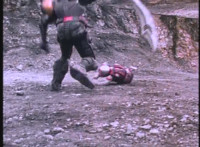 VR Kaitlin falls and rolls in a quarry, then gets up into a crouch. |
