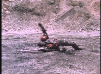 Gunslinger fires his shotgun forth, causing a dirt burst behind the flipping VR JB, who then falls and rolls, pulls out his Laser Pistol and fires it a few times, the blasts blocked by Gunslinger's pink energy shield. Gunslinger then deactivates the shield and talks, VR JB replies, Gunslinger cocks his shotgun and fires, VR JB diving into a ditch as dirt bursts before it. Gunslinger approaches, VR JB hides behind the dirt dune for a moment, then rushes off. |