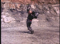 Gunslinger steps forth, lowers his gun, raises his head antenna, as VR JB races around behind the quarry rock piles. |