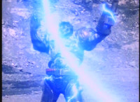 Gunslinger slashes his sword between VR Kaitlin & VR JB as they dodge and double strike him on the back, but he turns around and smokily slashes VR Kaitlin down, VR JB looks concerned, then dodges Gunslinger's slashes for a bit, VR Kaitlin goes to pull out her Laser Pistol, so Gunslinger turns his left hand into a gun and fires on her, bombarding her with bursts. As she collapses in dramatic slow motion, VR JB gets flipped over, then runs to her side, cradles her in his arms, where VR Kaitlin speaks to him weakly. Gunslinger taunts, so VR JB gently lays her back down, clenches his fist, then gets up, and dramatically races forth, leaps up, and gets blasted by Gunslinger, but his body suddenly glows blue, giving him the power to shatter the villain's energy shield with a punch, sending Gunslinger flying onto his back. He gets up and begins to spin around in a malfunctioning daze. VR JB recovers his saber, readies it, paces right as Gunslinger continues to writhe about violently. |