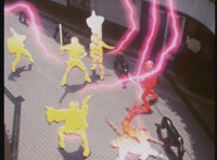 VR JB motions his arms about while his body trails, until he erupts into sparkle particles that reassemble as a giant energy image of him using the VR Techno Bazooka, firing both cannons forth. |
