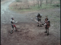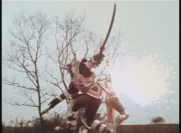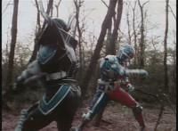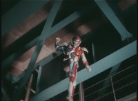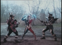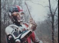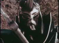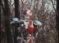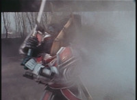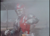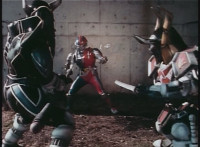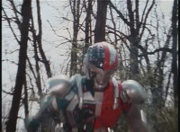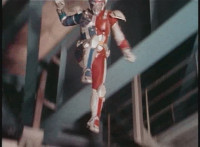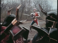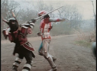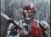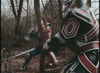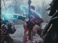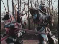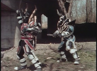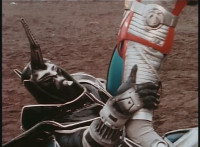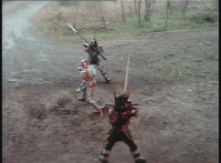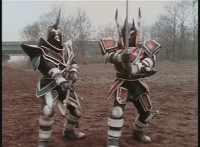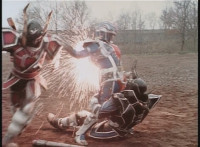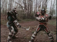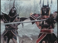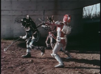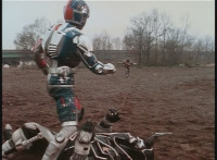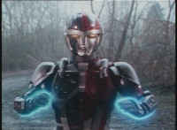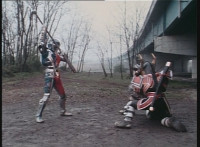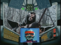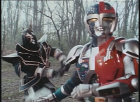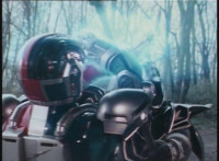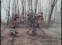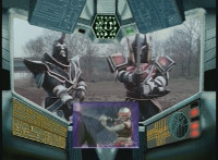 Shots of VR Ryan's robotic scalp, which transition into shots of his inner circuitry. Zoom in on Slice, then on Dice, VR Ryan nod-talks, then leaps down from his perch, lands and immediately dodges Dice, before running away from Slice. VR Ryan jumps and streaks across the landscape, then runs some more, Dice vaulting on his lance after him, only to get ambushed by VR Ryan, who hops in and strikes him down, then leaps in and is about to land a blow to his face, when he hesistates, then looks over and sees Slice running at him. Dice reaches up and grabs VR Ryan's legs, holding him there while Slice slashes him sparkily on the way by, he staggers away as Dice gets up and joins his brother, VR Ryan dazed. |