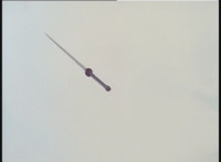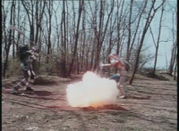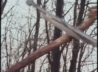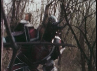 VR Ryan leaps up and Slice & Dice rush in and stab each other in the gut. VR Ryan flips over and lands nearby, as the Swordbots pull their daggers out of each other's stomaches, then collapse to their knees, VR Ryan looks behind him and turns around and runs that way. Slice & Dice throw their daggers at him, but he catches one and uses it to block the other, causing it to stick in the ground. VR Ryan tosses the dagger aside, then reaches down to pick up Dice's lance, the Swordbots comforting each other while still doubled over. |