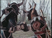 The camera lowers into the Virtual Dungeon, as Grimlord addresses his assembled Mutants, a pair of women kneeling in the middle. |
