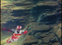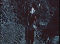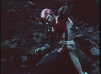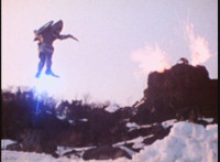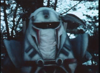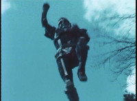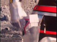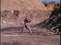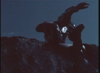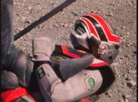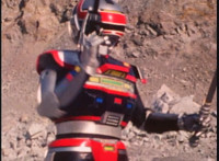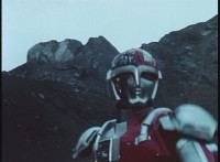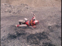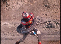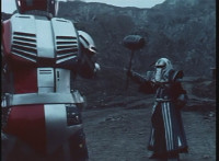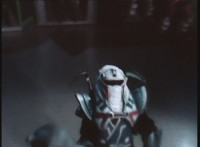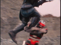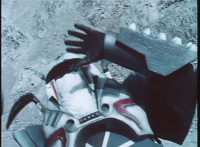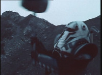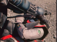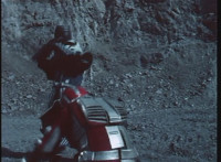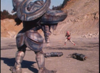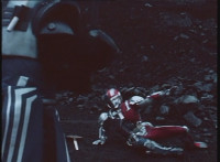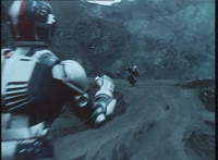 Spiderbot flies straight up and fires on VR JB, bursting around him, before VR JB then leaps forth and swoops at Spiderbot, who kicks him down to the ground, then swings down and lands on VR JB, who struggles underfoot and speaks. Spiderbot reaches down and grabs VR JB by his helmet, then flings him away, where he lands in the quarry, and poses. |