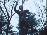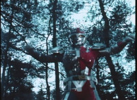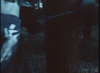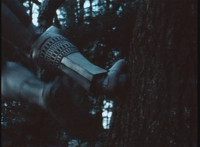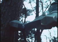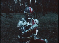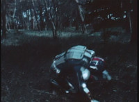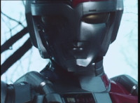 VR Ryan dodges the next scythe, rolling over into a clearing, where he speaks, then blinks his scalp lights and scans Hammerbot, finding the shape of a dude within him. VR Ryan talks, then gets up and leaps up past Hammerbot, who tosses another scythe, that VR Ryan chops away in midair, but causes him to fall to the ground beside a tree. Hammerbot slams his hammer down at him, missing and hitting the trunk of tree, prompting stock footage of a tree falling to play. |