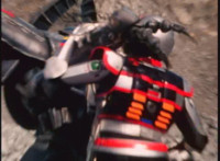 VR JB stabs Spiderbot with his extended glowing Laser Lance burstingly, then rushes forth and retracts it, before twirling it. |