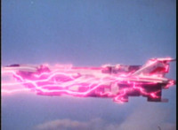 Air Fighters fire pink electricity, then as they pass over the Skybase, explosions erupt upon the ship. |