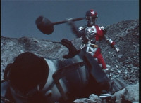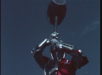 Hammerbot slams his hammer into the side of a chamber, causing Invincible Blade to fall off from atop it. He then gets up and charges forth, so in dramatic slow motion, Hammerbot hammers Blade's head, causing it to explode. |