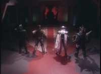 As seen from the back of the room, Grimlord addresses the silent, still, and darkened crowd of Mutants. |