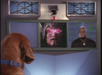 Grimlord's energy screen above the mutants in the Dungeon shows an image of General Ivar, motioning his right hand as he talks close. |