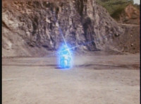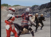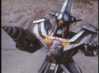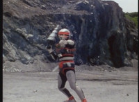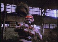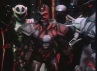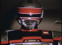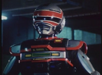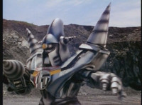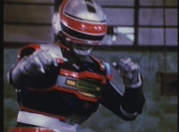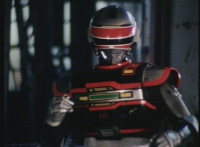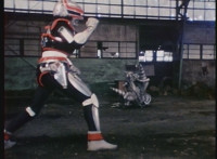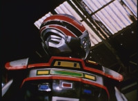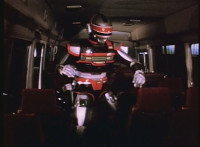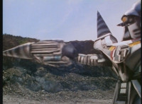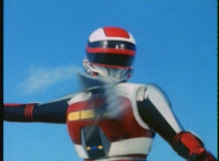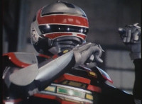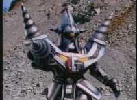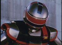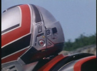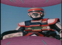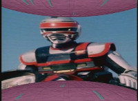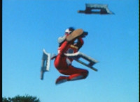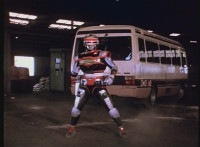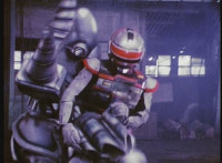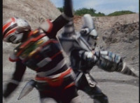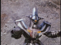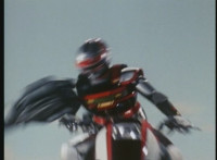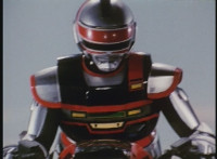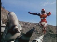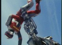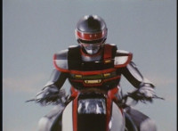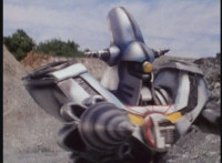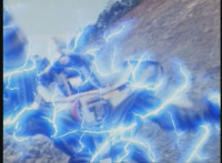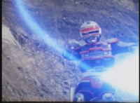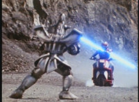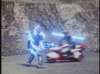VR JB, with his Laser Lance ready, drives the Fighterbike at Drillbot, and when close enough, stands up on it and slashes his blade at the monster, causing him to crackle as he passes by. |