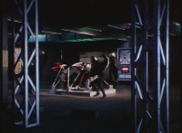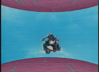 VR JB finishes posing, then rides his Fighterbike forth in midair. |