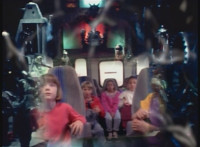 Grimlord's energy summons an energy screen above the mutants in the Dungeon, forming an image of Silvy Larson and the other captured kids in the van. |