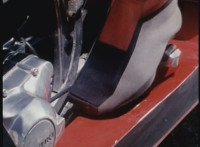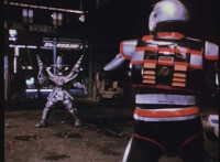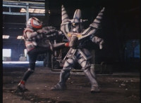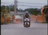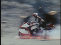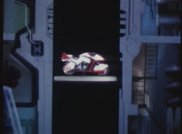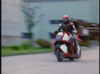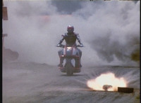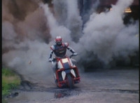 Cuts prior shot of Skugs guarding Drillbot; transitions in; cuts follow-ups of VR JB landing on Fighterbike, due to Suzuki placement. |