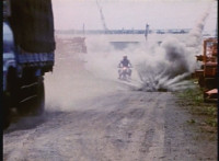The van turns right as the road veers, the blue truck still behind it, suddenly three Skugs pop out from under the canopy and toss bombs, bursting around VR JB and his Fighterbike, but he's undeterred, driving on through the smoke and firing lasers from his bike at the truck, causing a bursting that sends the Skug driver swerving and crashing the truck into some girders. |