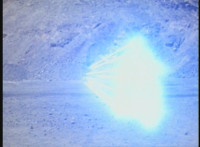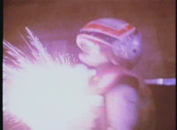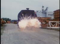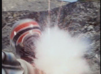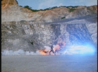 A series of explosions in a missile silo of some kind. VR JB drives the Fighterbike away from multiple dirt bursts as they erupt just behind him, escaping the warehouse safely. |