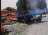 The van passes by us, as a blue truck pulls in behind it, zoom in on VR JB on his Fighterbike following in the distance. |