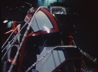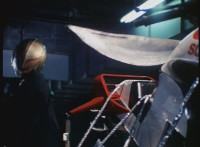 A Skug presses a button on a remote, causing the VR Fighterbike to begin to lower into the ground. It drops multiple levels on an elevator, finally reaching a room where it gets locked in place and wrapped in cords, as a trio of Skugs rush in and dance around the captured cycle. |