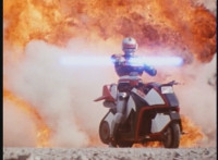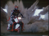 VR JB jolts as he comes to a stop, posing with his Laser Lance on his VR Fighterbike as Drillbot collapses and explodes massively behind him. |