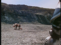 VR Kaitlin leaps forth with her elbow out, then dives over a pair of Skugs, lands atop a quarry hill and proceeds to make her way down, taking down three Skugs. The third falls on his back but quickly gets back up. VR Kaitlin whips out her VR Laser Pistol and prepares to fire. |