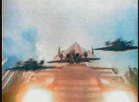 Air Fighters fire pink electricity, then as they pass over the Skybase, explosions erupt upon the ship. |