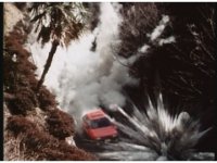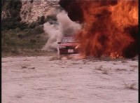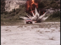 Kaitlin's car drives through a field as explosions being to erupt around it. |