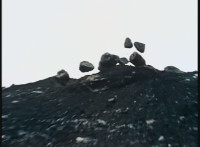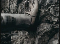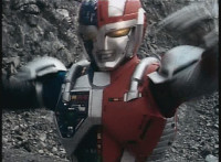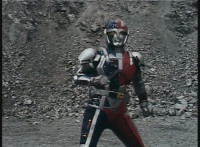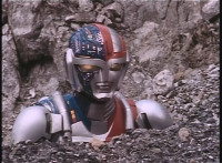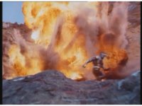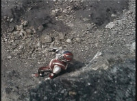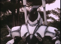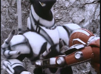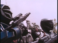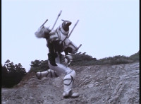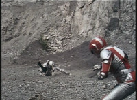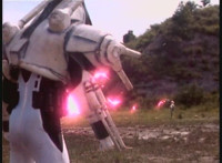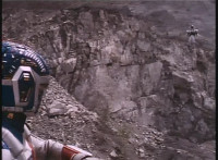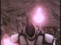 Zoom in on Polarbot in the nearby woods, flexing his arms. VR Ryan spots him, leaps up and flips over into a jumpkick, knocking Polarbot into the air. VR Ryan then lands in an empty quarry, finding no sign of his foe for a moment, then spotting him atop a nearby cliff. Polarbot begins to fire his cannons, explosions erupt around VR Ryan as he runs away, and dives behind a heap of dirt. He sticks his head out, sees more firing, and ducks back down as more explosions erupt. |