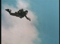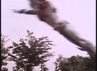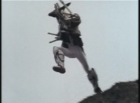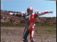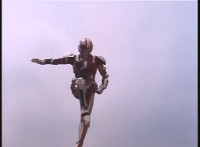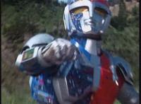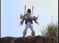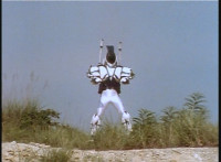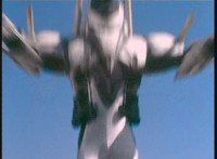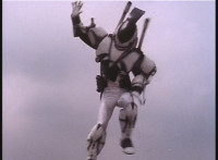 Air Striker reaches out in close up. Then his back propeller begins to spin, as he spreads arms and flies into the sky. |