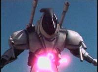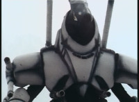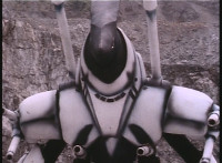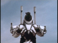 Close on Fighterbot flying along as he lowers his nosecone head tip. |