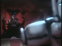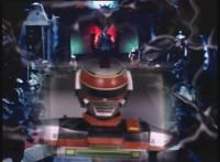 Grimlord's energy summons an energy screen above the mutants in the Dungeon, forming an image of VR JB talking in the Skybase cockpit. |