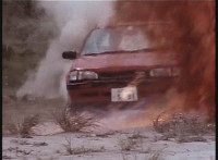 Kaitlin's car swerves off the road just as a dirt burst erupts in the road. |