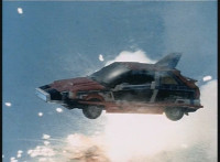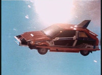Close on Air Striker flying, then a downward angle shot of Kaitlin's car driving on the road (on the left! shh!) as Air Striker hovers just above and Fighterbot swoops past. |