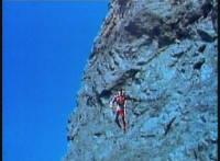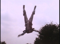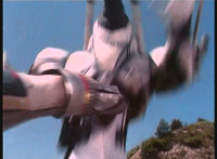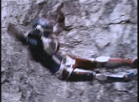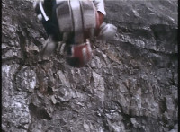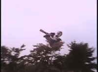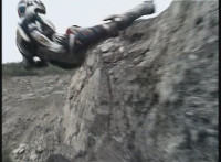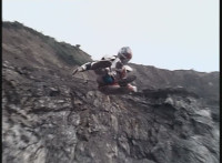 VR Ryan races through the quarry as explosions erupt all around him, avoiding getting hit and finally reaching the safety of bracing against a cliff wall. Polarbot peeks over the edge and when spotted, VR Ryan runs out a few steps, turns around, then jumpkicks into the wall, causing a rockslide and quake that sends Polarbot falling off the side of the cliff. With his foe on his level, VR Ryan leaps up, flips over and does a jumpkick into Polarbot, sending him flying back and falling down. VR Ryan does a few more flips and throws his whole body into the air. |