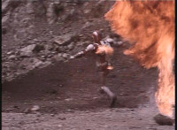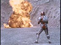 As a fireball explosion erupts on a cliffside, VR Ryan runs past it. |