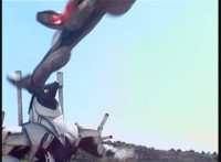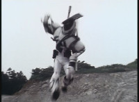 Zoom in on Polarbot standing on a grassy cliffside. VR Ryan, now in a less sandy field, stands up, and Polarbot fires his stomach guns down at him. VR Ryan dives to our left in slow motion as a fireball explosion erupts before him. Polarbot fires some more, and more explosions erupt around VR Ryan. Polarbot leaps down into the field and fires some more, dirt bursting around VR Ryan. Polarbot then rushes over to him, finding him missing, before suddenly looking upward. VR Ryan floats beside a cliff wall, launching off of it and jumpkicking down at Polarbot, sparking dropping on a shoulder, then landing, turning around, and rushing forth. |