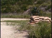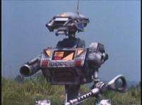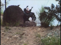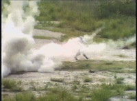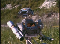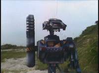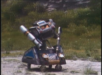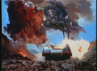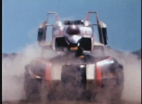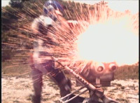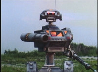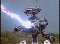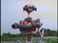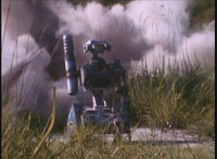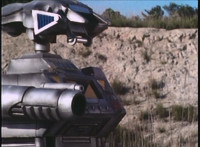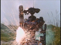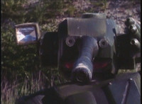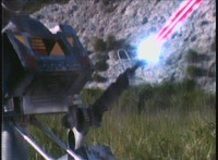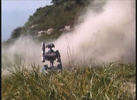 Another dirt burst erupts right behind Trooper Terminator, but misses his completely. Now stopped, Trooper Terminator raises his neck, looks from side to side, then lowers his head. He then fires his cannon at the bunker Ballistix is standing behind, dirt bursting it. He then fires his laser at Cannonnose's bunker, exploding it. |