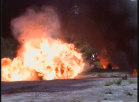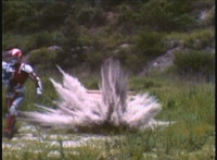 A dirt burst erupts before Trooper Terminator, who merely rolls through the dust. |