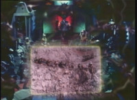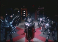 Grimlord's energy summons an energy screen above the mutants in the Dungeon, forming an image of Fighterbot & Air Striker flying through the air, then landing on the ground together. |